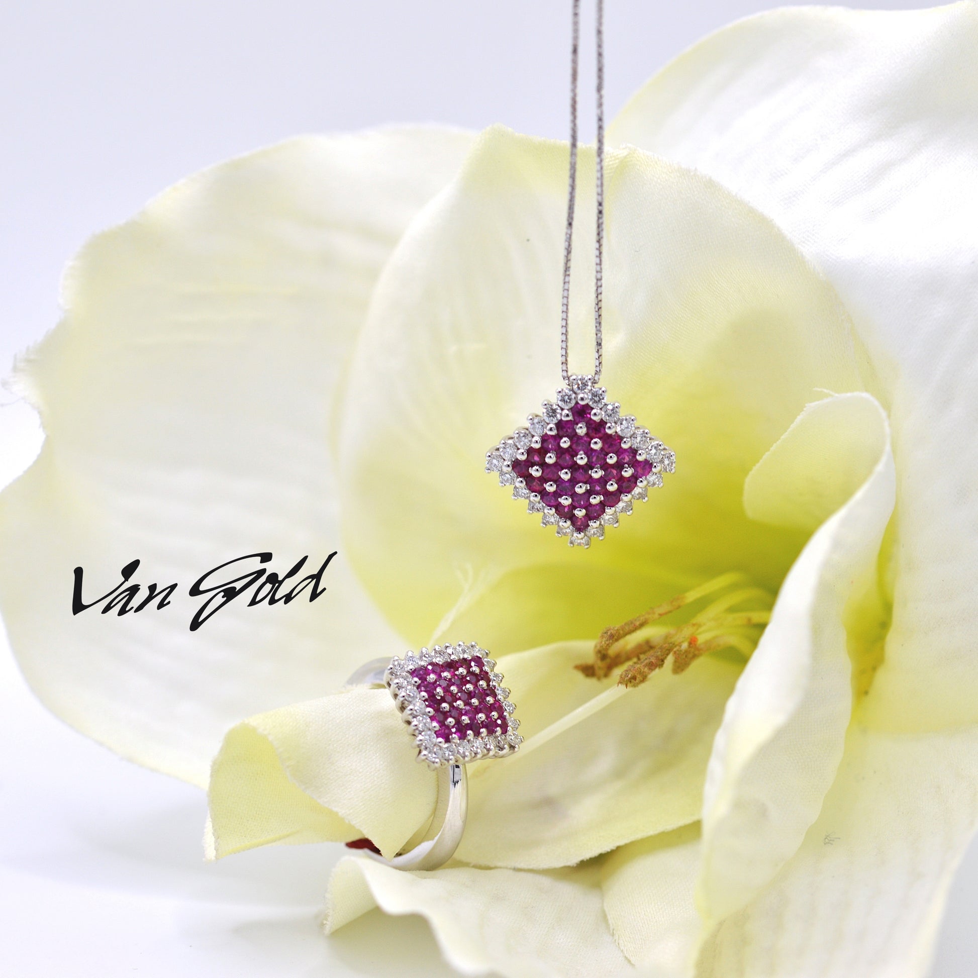 Completo in oro bianco 18Kt con diamanti e rubini.