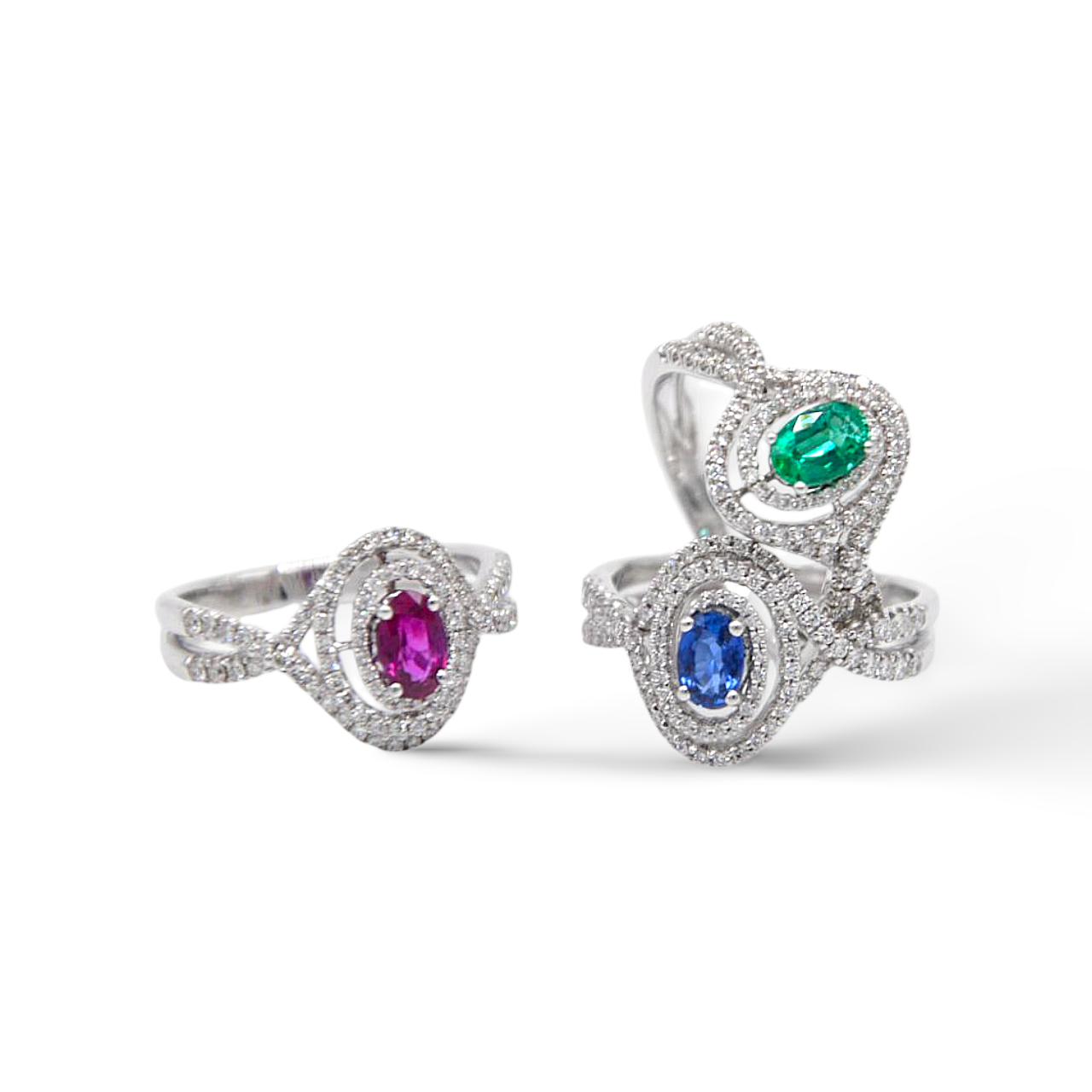 Anelli in oro bianco 18Kt, diamanti e pietra colore a scelta.
