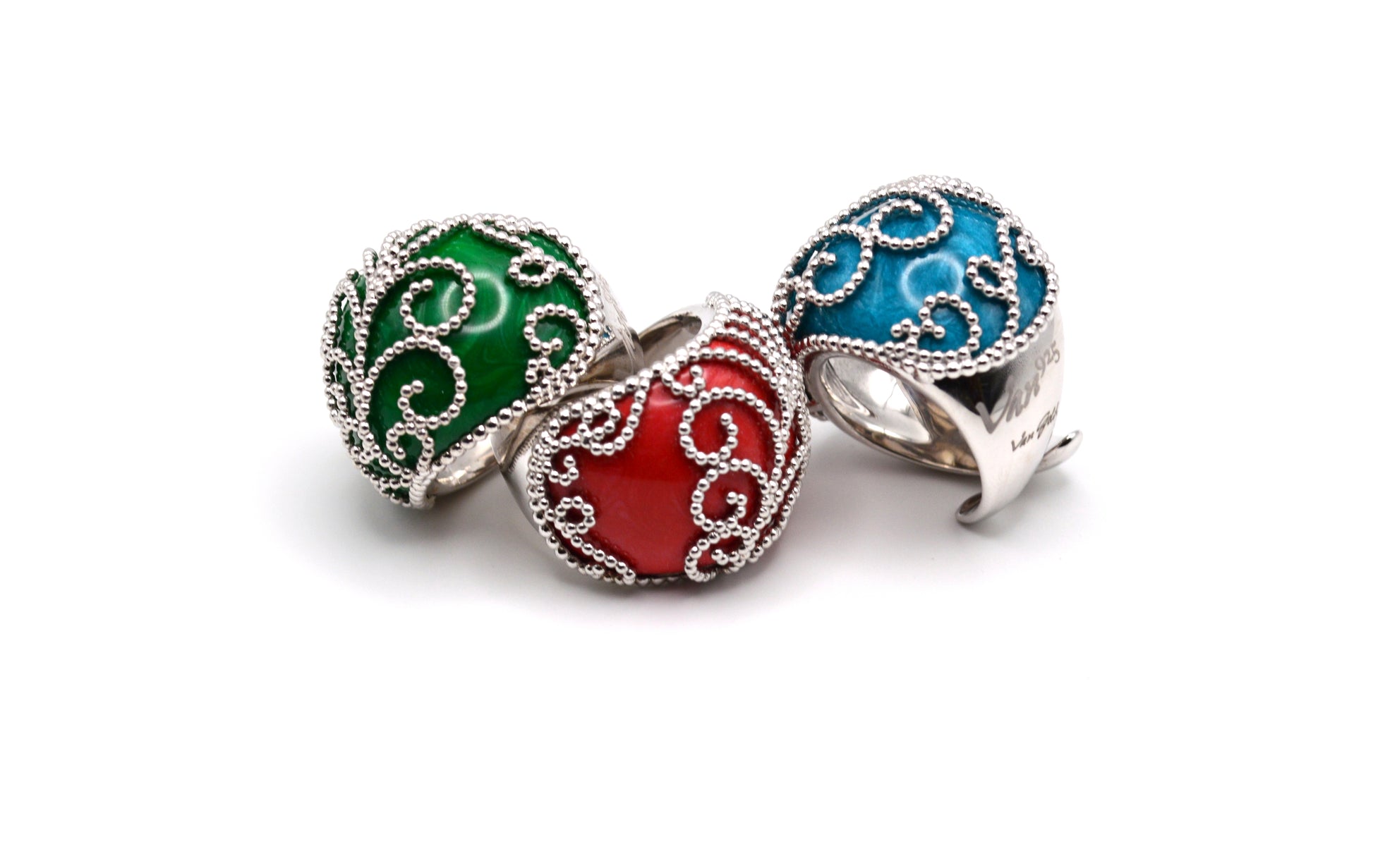 Tutti i gioielli della linea VAN925 sono realizzati da abili artigiani italiani con smalti provenienti dalla Germania, atossici con assenza di piombo e argento 925 esente da nichel nelle leghe e nei processi galvanici come da normative italiane ed internazionali vigenti.