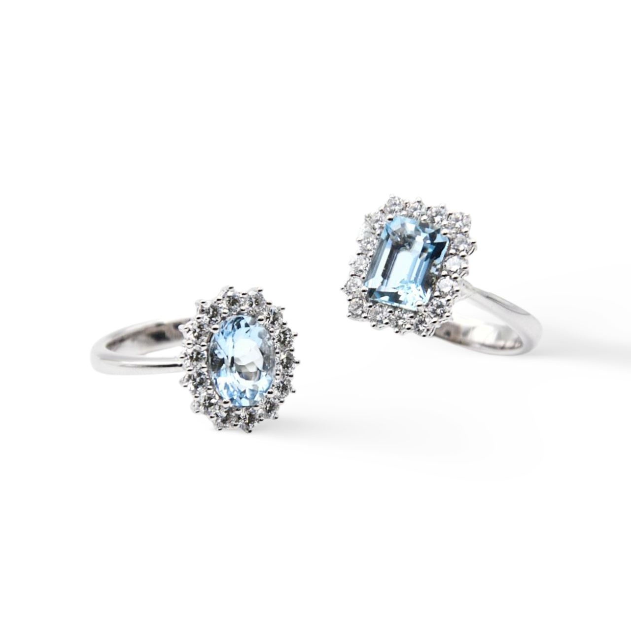 Anello in oro bianco 18Kt, diamanti e acquamarina.