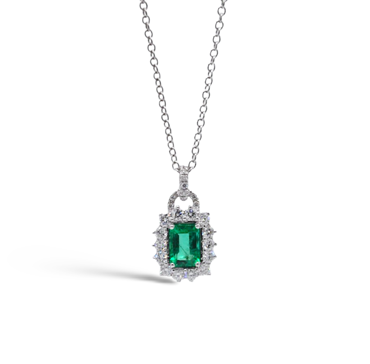 Collana in oro bianco 18Kt, diamanti e smeraldo certificato GIL.