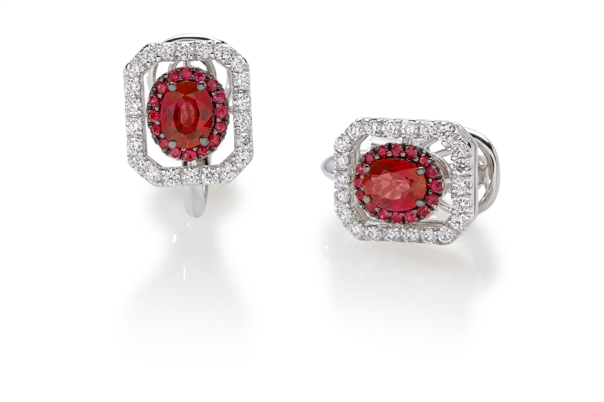 Orecchini in oro bianco 18Kt, diamanti e pietra colore a scelta.