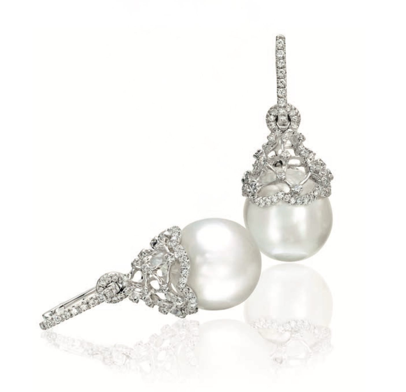 Orecchini in oro bianco 18Kt, diamanti e perla.