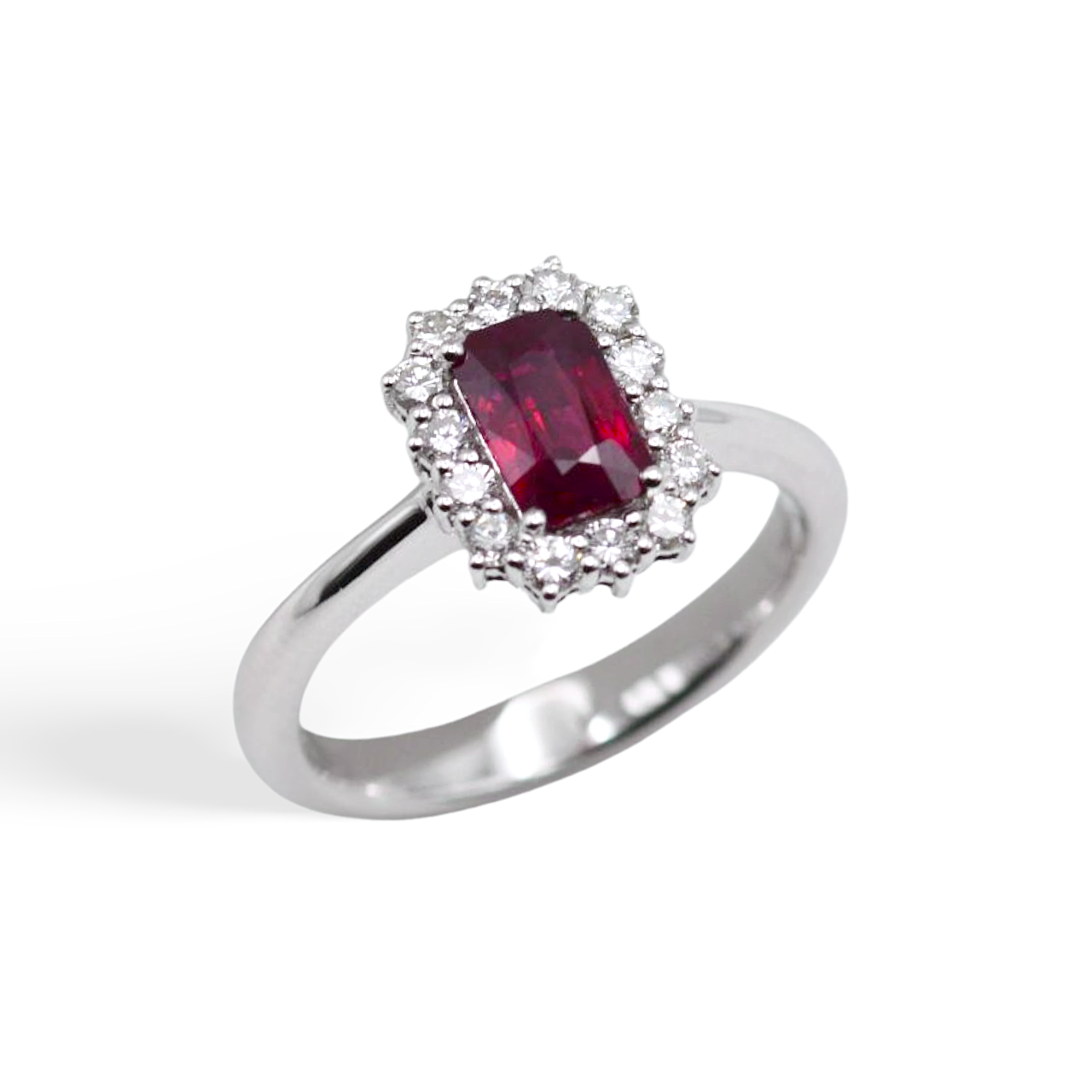 Anello in oro bianco 18Kt, diamanti e rubino certificato AIGS.
